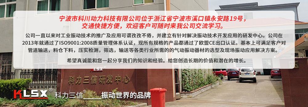 宁波市科川动力科技有限公司位于浙江省奉化市溪口镇永安路19号,本公司拥有先进的工业振动技术、气动振动器,气动锤,气动敲击锤开发技术,同时也有气动振动器及气动锤的研发中心,一直致力于为客户提供优质的产品和技术服务。能满足客户;管路输送。漏斗下料、压实检测、筛选、输送、等各类行业所需的气动振动器材及振动解决方案,真诚的和大家一起分享我们的知识和经验。 公司通过了****:2008质量管理体系认证,****:2004环境管理体系认证,欧盟 CE 产品出囗认证,并拥有十九项产品**证书。 所有的荣誉奠定了公司坚实的基础,意味着本公司优异的工作流程,标准的作业方法和高质量的产品及相关技术服务的优
